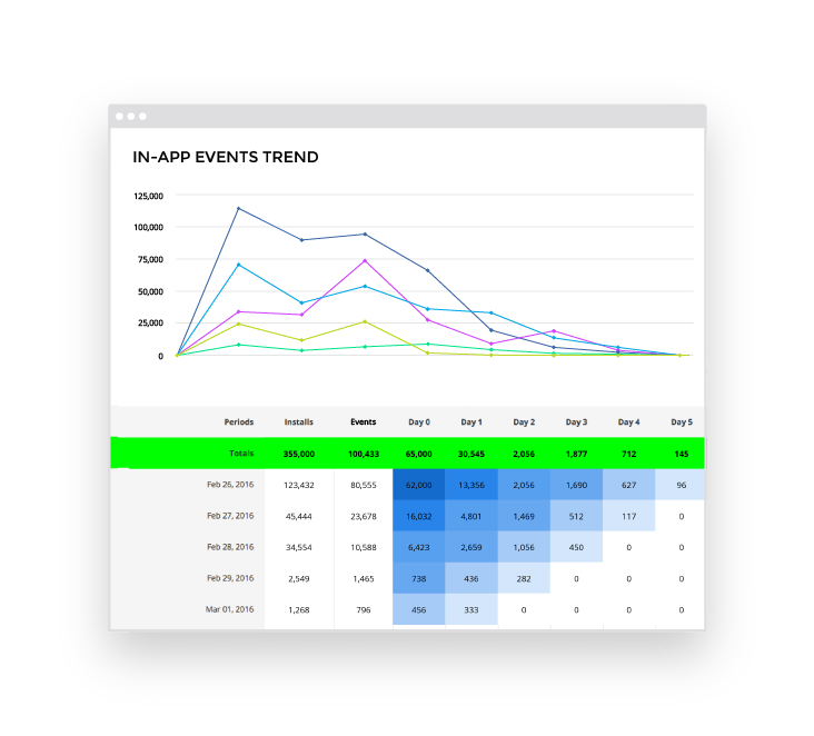 Our analytics system integrated with the main tracking and mobile measurement platforms, analyzes post install behaviour of users to identify the most suitable audience for apps being promoted, optimizing their entire mobile strategy